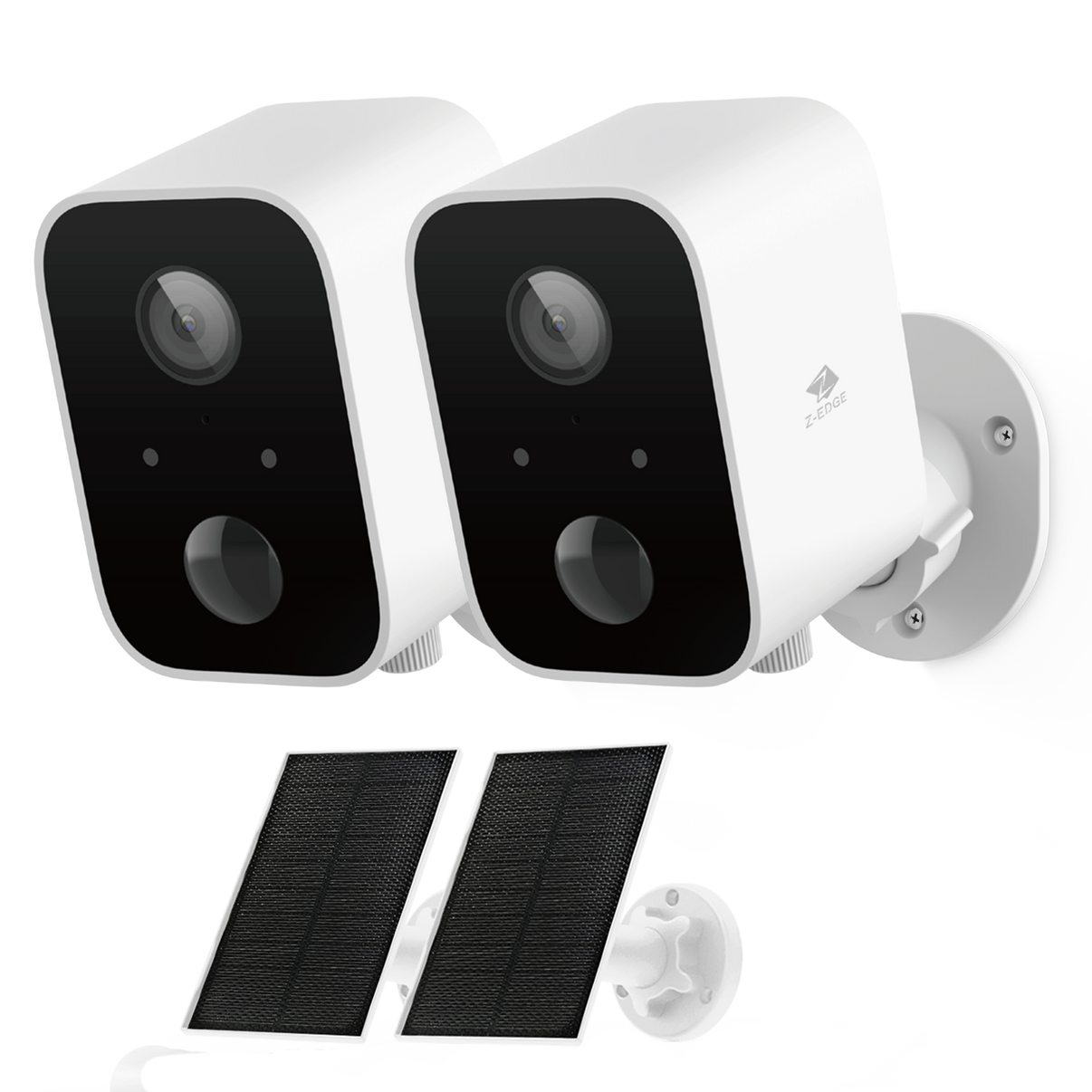 スマートカメラ x2、充電ケーブル、電源アダプター、カメラマウントキット;ソーラーパネル&マウントキット
